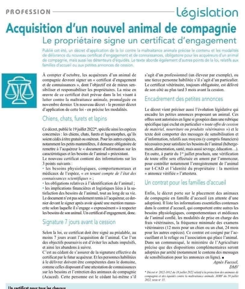 TOUTE PERSONNE VOULANT ADOPTER OU ACQUERIR UN CHIEN, UN CHAT, UN FURET OU UN CHEVAL DEVRA ETRE TITULAIRE D'UNE ATTESTATION DE CONNAISSANCES DES BESOINS DE L'ANIMAL.