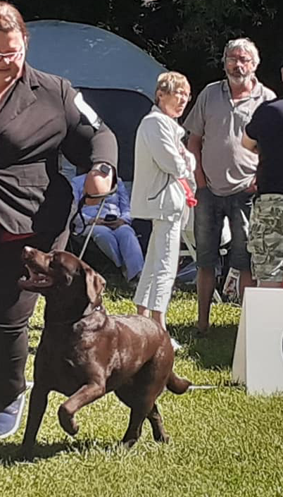 notre petite labrador choco est désormais dans la cours des grands et se voit confirmée ce jour, par un autre juge bien évidemment qui apprécie notre petite boule de poil également (la confirmation doit se faire avec un juge français ) et re belotte on repasse sur le ring et on présente .. dure journée pour un choco
